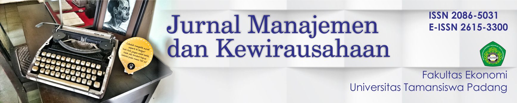 Jurnal Manajemen dan Kewirausahaan (JMK) with the printed media ISSN 2086-5031 and online media ISSN 2615-3300 is a scientific publication media containing the results of research, studies, thoughts, and analysis regarding public policy in the fields of management, entrepreneurship, and related fields, such as education, health, and the environment. Jurnal Manajemen dan Kewirausahaan is published by the Faculty of Economics, University of Taman Siswa Padang as a medium for academics, government, private sector, and experts to communicate and assist decision making. The papers are published after the review process from the expert reviewers in the field concerned.